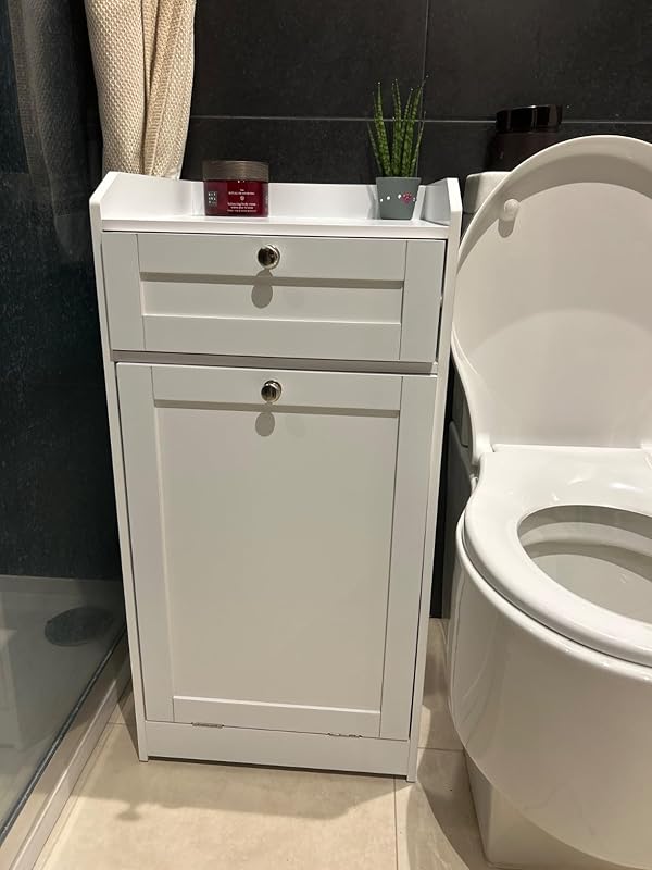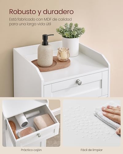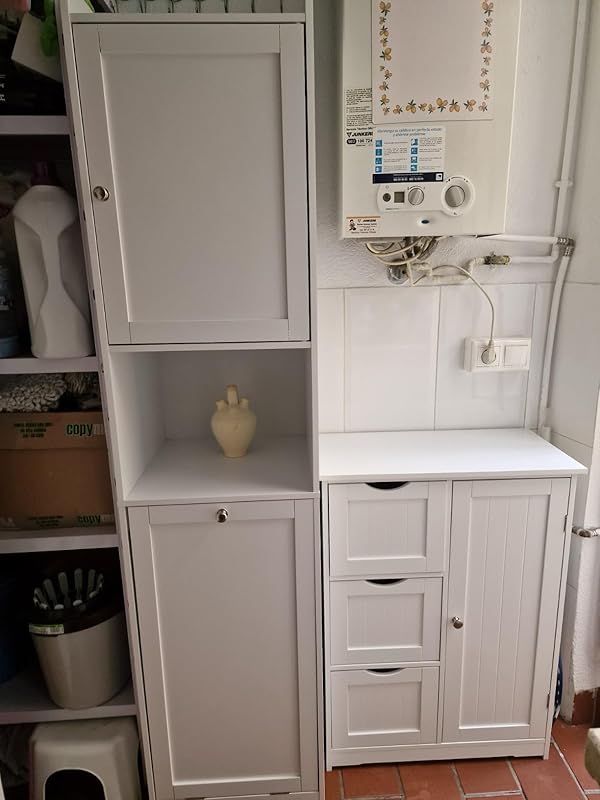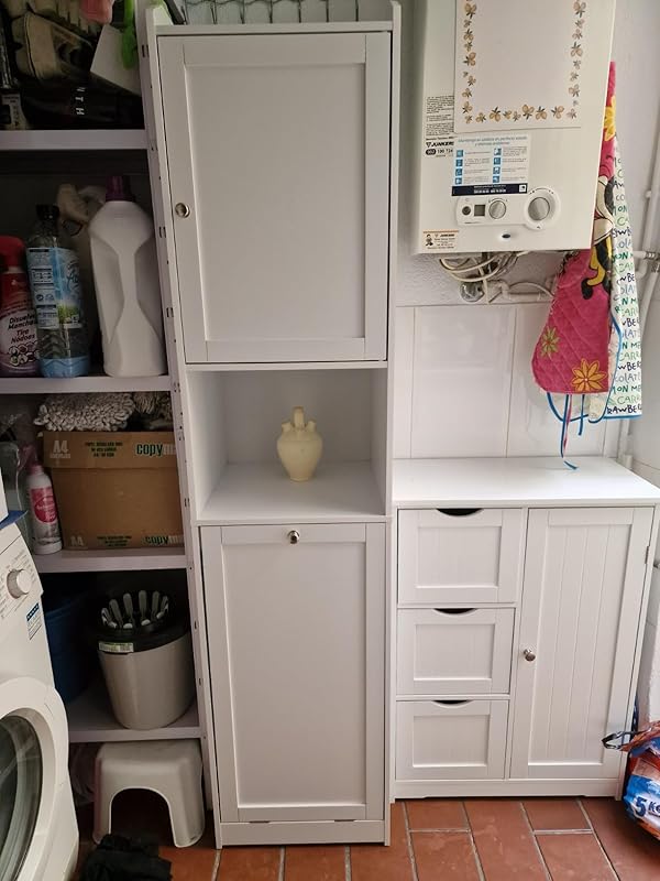 Armario y cesto en uno: Con nuestro armario de baño con cesto, dispondrás de un estante y un cajón para acceder fácilmente a tus artículos, así como de espacio para guardar la colada, lo que satisfará todas tus necesidades.