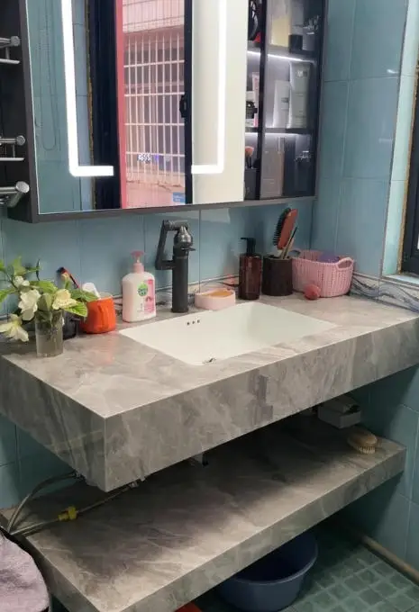 El lado izquierdo de la parte superior es un espejo, con luces táctiles LED inteligentes alrededor del espejo, que se pueden encender al tocar, y las luces son suaves y hermosas. El armario de zonificación en el lado derecho de la parte superior adopta una puerta de armario de vidrio para facilitar la colocación y recogida. Debajo hay un Gabinete de baño de piedra con lavabo, estilo lujoso de alta gama, que muestra su gusto y estilo. Entre el lavabo de cerámica y el Gabinete de pizarra hay un diseño integrado sin grietas, sin ángulos muertos limpios. El material de…
