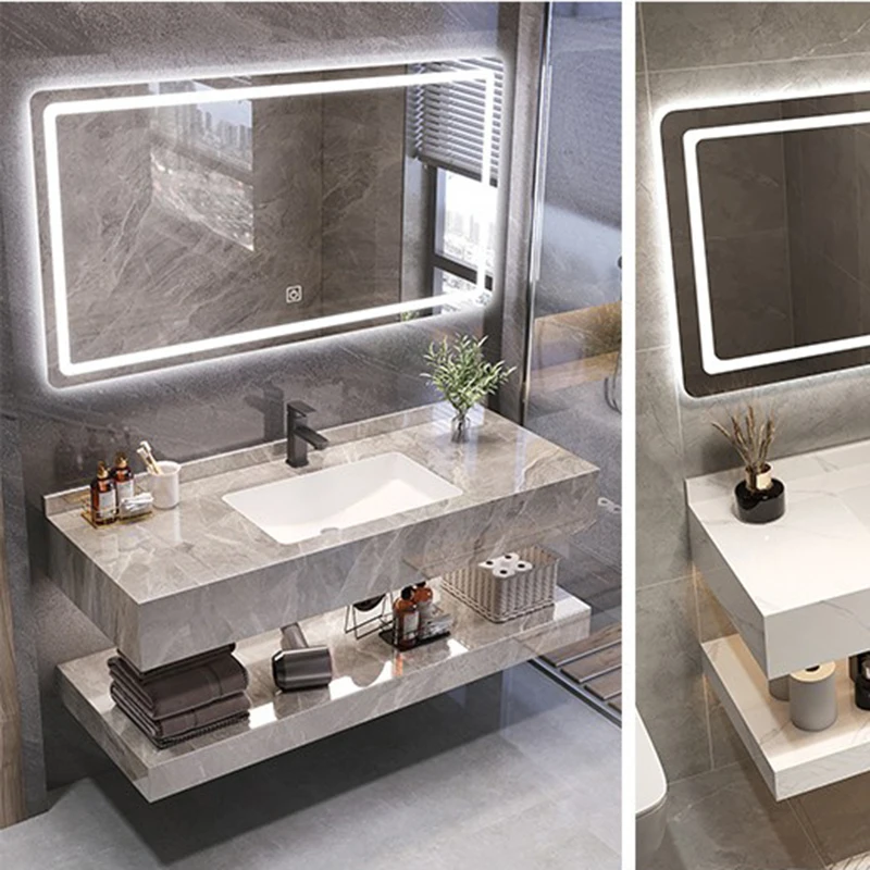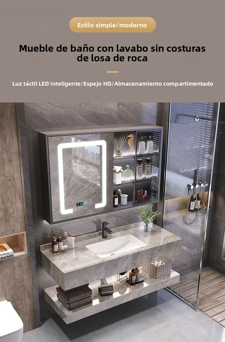 El lado izquierdo de la parte superior es un espejo, con luces táctiles LED inteligentes alrededor del espejo, que se pueden encender al tocar, y las luces son suaves y hermosas. El armario de zonificación en el lado derecho de la parte superior adopta una puerta de armario de vidrio para facilitar la colocación y recogida. Debajo hay un Gabinete de baño de piedra con lavabo, estilo lujoso de alta gama, que muestra su gusto y estilo. Entre el lavabo de cerámica y el Gabinete de pizarra hay un diseño integrado sin grietas, sin ángulos muertos limpios. El material de…